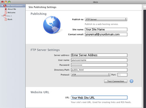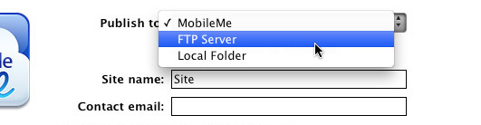 Having Problems Publishing? Apple has identified a bug in iWeb 09 regarding its FTP functionality for some users. A user will be able to successfully test the connection to the server, but will fail during publishing. Until Apple fixes this bug in their FTP publishing, you will need to use the iWeb 08 instructions below. Unfortunately, the problem isn't on our servers so it's out of our ability to rectify the issue.