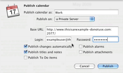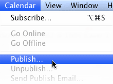 People can then subscribe to your published Calendar in their iCal application by opening iCal, clicking on the Calendar menu, selecting Subscribe... and entering the full URL of your published Calendar. (example: http://www.MyDomainName.com/WebDavFolderName/calendarname.ics) Every time a subscriber to your calendar opens their iCal, they will see your updated Calendar as well as their own.