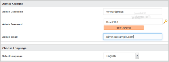 - Admin Username: Your new WordPress username (for security reason do not use the "Administrator" or the "Admin" username.