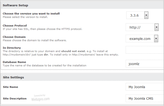 - In Directory: If you want to install this in a directory, for example example.com/directory, enter the directory name. Otherwise, leave this blank to install in your main domain example.com