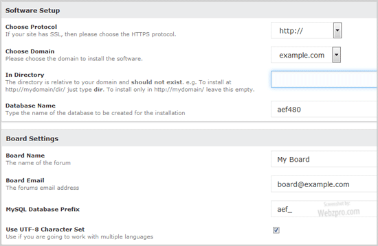 - In Directory: If you want to install this in a directory, for example example.com/forum, enter the directory name. Otherwise, leave this blank to install in your main domain example.com